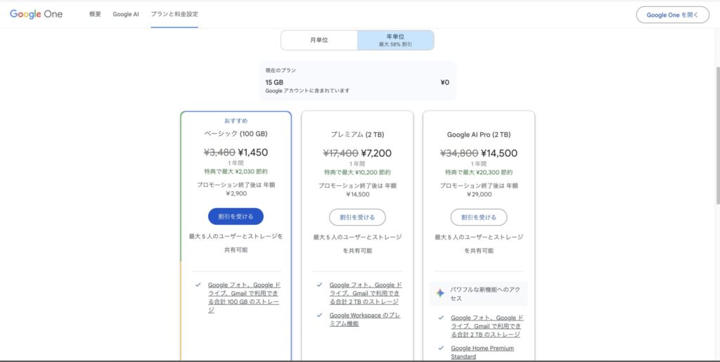 まずはGoogle Oneのプラン選択画面へ。僕が選んだのは、画像右のGemini 3のフル機能が使える**「Google AI Pro(2TB)」**です。年額プランだとかなりお得になりますよ!