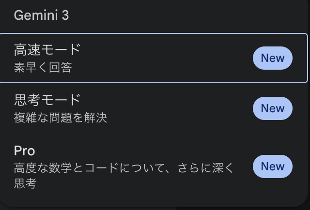 契約が完了すると、Geminiの画面でモード選択ができるようになります。「素早く回答してくれる高速モード」や「複雑な問題を解く思考モード」、そして僕がPython学習で頼りにしている「Pro」など、用途に合わせて切り替え可能です。